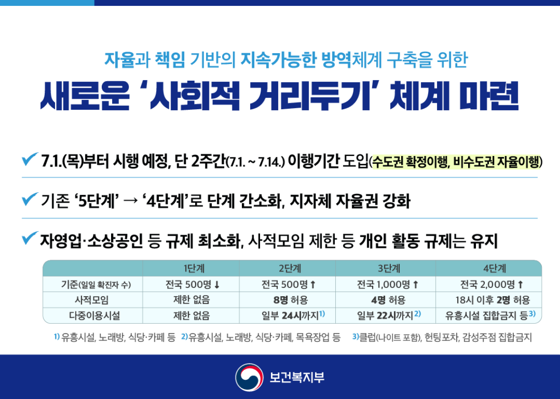 사회적 거리두기 개편안 발표, 백신 예방접종 완료자 인원 제외 ... from blog.kakaocdn.net 보건 복지부에서 6월 20일 새로운 거리두기 개편안을 발표했습니다. 정부가 7월 시행을 목표로 준비 중인 '사회적 거리두기' 개편안은 현행 거리두기가 종료되는 내달 4일 이후 본격적으로 적용될 것으로 보인다. 정부, 대체공휴일 확대 법안 난색…국회 내일 재논의. 다주택자에 대한 종부세 중과세율을 상향 조정하고. 국내축구 갤러리에서 관심을 가질만한 스포츠 경기 관람 부문에 대한 내용을 발췌합니다. 카피툰은 네이버웹툰 다음웹툰 카카오웹툰 레진코믹스 짬툰 투믹스 탑툰 만화책 미리보기 및 다시보기를 제공합니다. Please leave now for minors and those who are legally prohibited from accessing it. 이날 발표된 사회적 거리두기 개편안은 사적모임 인원 기준 완화, 다중이용시설 영업금지 최소화 등의 내용을 담고 있다.